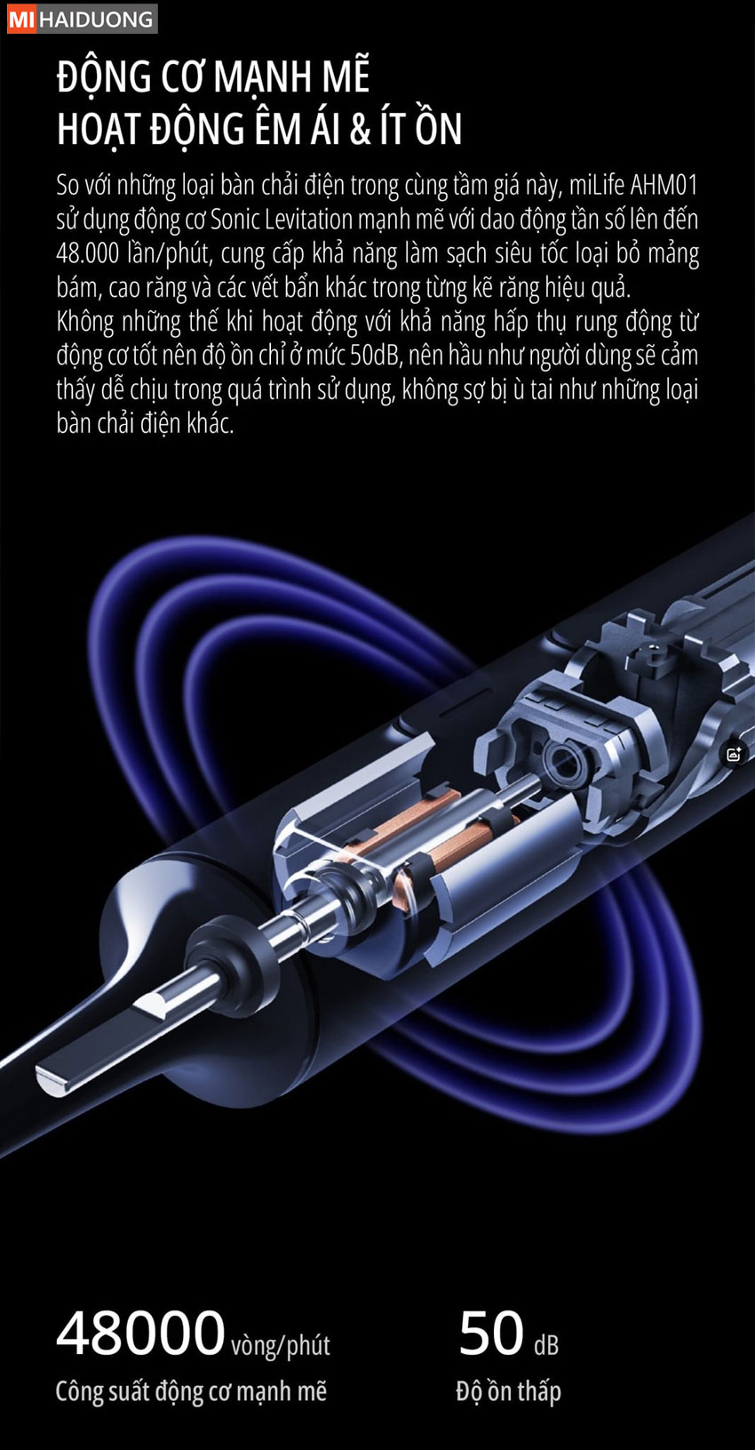 Với động cơ siêu âm mạnh mẽ lên đến 48.000 lần rung/phút, miLife AHM01 giúp loại bỏ mảng bám hiệu quả gấp 10 lần so với bàn chải thường. Đặc biệt, công nghệ này còn giúp kem đánh răng tạo bọt mịn, len lỏi vào từng kẽ răng, làm sạch tối ưu.
