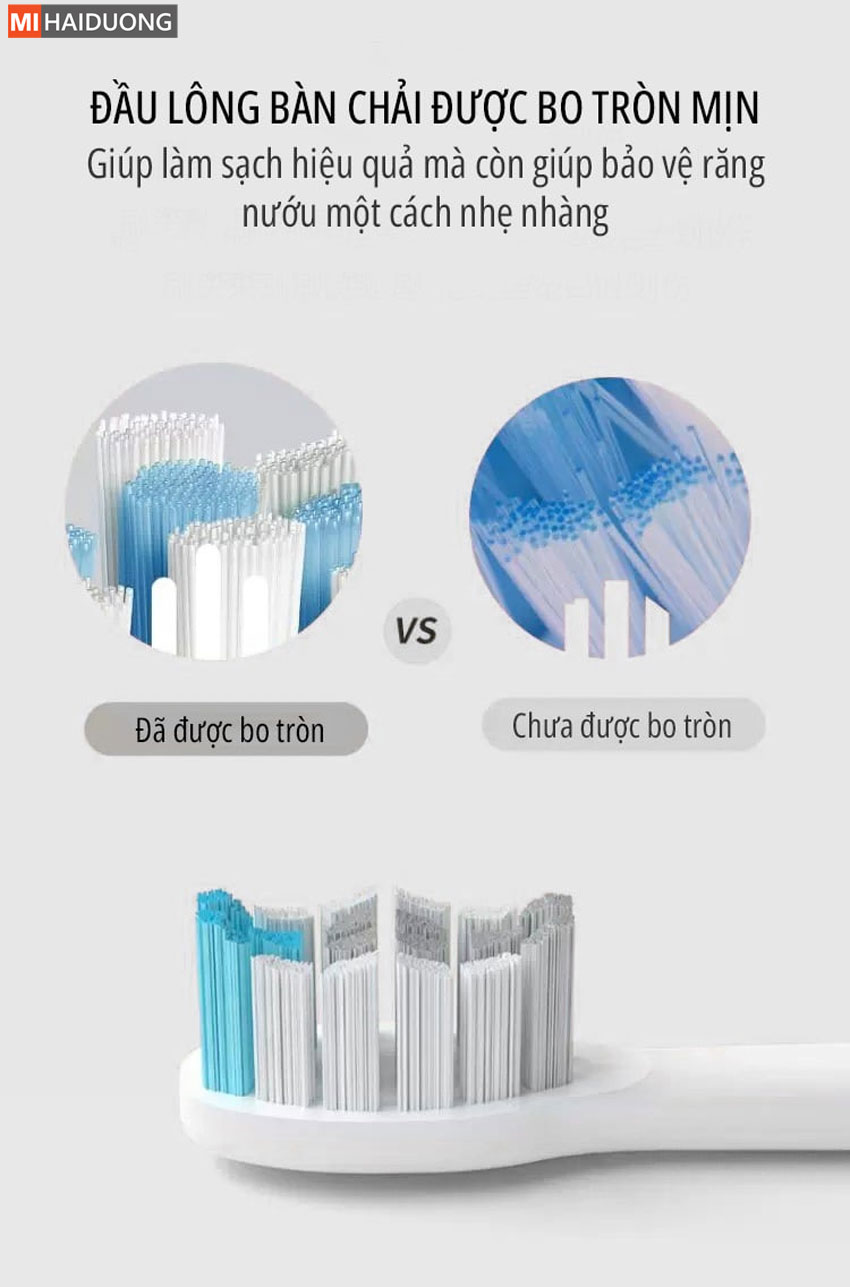 Đầu bàn chải điện miLife AHM01 được thiết kế tròn nhỏ kết hợp với thiết kế After Round 3D độcg, rất thích hợp với những người dùng khoang miệng nhạy cảm và có thể đi sâu vào trong để làm sạch đến từng răng trong cùng. Bàn chải được làm bằng sợi nylon kháng khuẩn mềm DuPont 0.15mm, cộng thủ các tiêu chuẩn an toàn của FDA, nên cực kỳ thân thiện với khoang miệng của người dùng. Hơn nữa, đầu lông bàn chải còn được làm tròn nhiều lần kết hợp với dao động vi mô ngang nhẹ nhàng nhẹ nhàng của đầu bàn chải sẽ không chỉ giúp làm sạch hiệu quả mà còn giúp bảo vệ bảo vệ một cách nhẹ nhàng nhẹ nhàng.