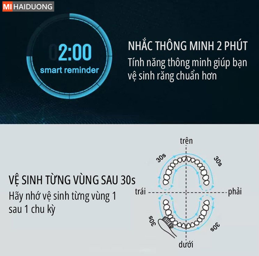 - Nhắc nhở chuyển vùng sau mỗi 30 giây: Giúp bạn làm sạch đều cả hàm răng.