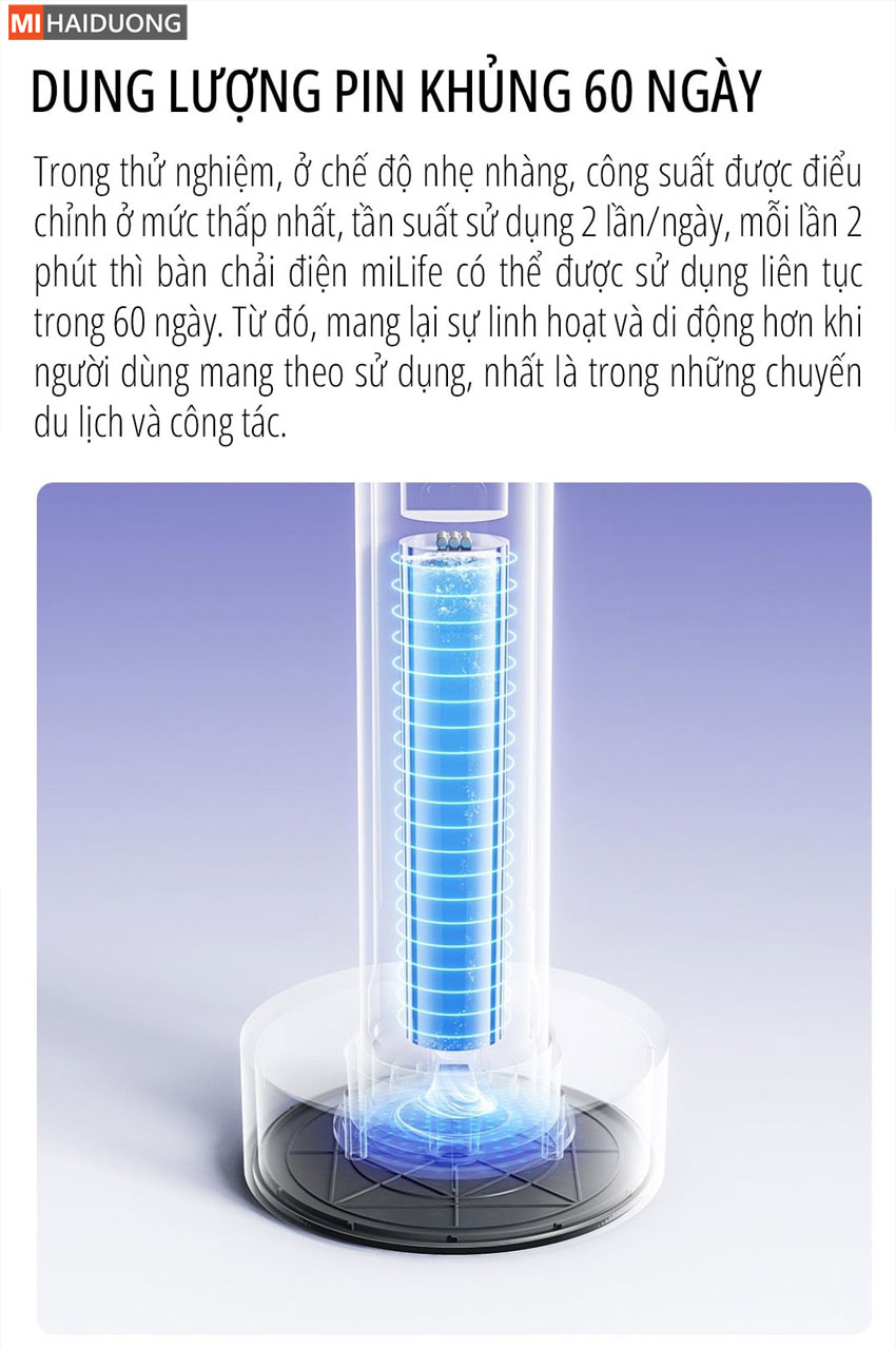 Sử dụng hai lần mỗi ngày (2 phút/lần), miLife AHM01 có thể hoạt động suốt 60 ngày sau một lần sạc. Sạc cảm ứng 360° giúp quá trình sạc nhanh chóng và an toàn.