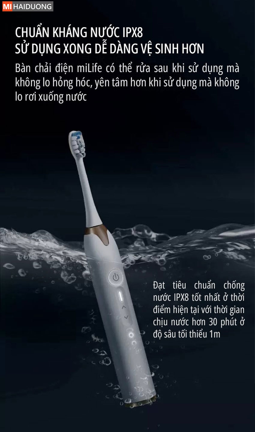 Khả năng chống nước IPX8 giúp bạn yên tâm khi sử dụng trong nhà tắm. Bạn có thể vệ sinh bàn chải trực tiếp dưới vòi nước mà không lo hỏng hóc.