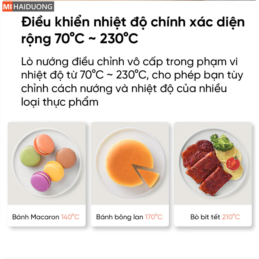 Đặc biệt,Lò nướng điện Xiaomi Mijia MDKXDE1ACM còn có dải nhiệt độ rộng 70-230 độ C, có thể điều chỉnh vô cấp, cho phép bạn có thể tùy chỉnh nhiệt độ theo từng loại thực phẩm. Nhiệt độ lên men 40 độ C liên tục không đổi, đi kèm tính năng hẹn giờ 120 phút giúp chiếc lò trở nên đa năng hơn ngoài việc nướng thực phẩm như sấy trái cây khô, làm bánh, rã đông, lên men,…cùng các chức năng khác.