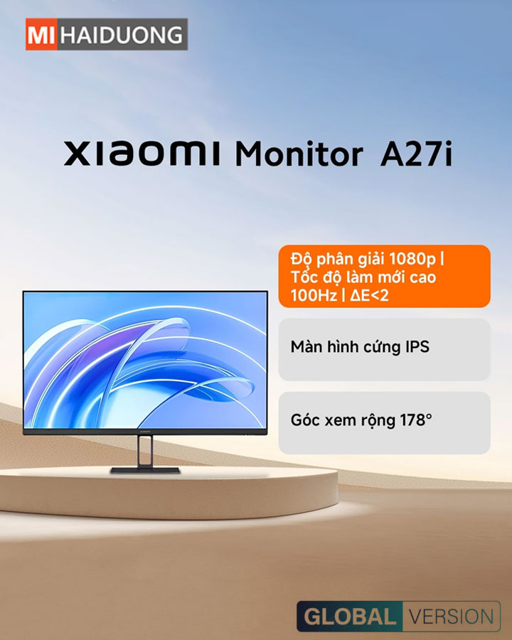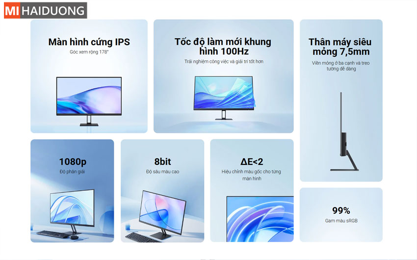 Màn hình máy tính Xiaomi A27i 27 inch mang đến trải nghiệm hiển thị mượt mà và sắc nét nhờ độ phân giải Full HD (1080p) cùng tần số quét 100Hz, phù hợp cho cả làm việc lẫn giải trí. Tấm nền IPS cao cấp với góc nhìn rộng 178° kết hợp dải màu sRGB 99% và độ chính xác màu ΔE<2 giúp hình ảnh hiển thị chân thực, sống động đến từng chi tiết. Thiết kế siêu mỏng chỉ 7.5mm cùng viền mỏng ba cạnh tạo nên vẻ ngoài hiện đại, tinh tế, dễ dàng bố trí trong mọi không gian làm việc. Ngoài ra, màn hình còn hỗ trợ treo tường tiện lợi, tối ưu diện tích và nâng cao tính thẩm mỹ cho góc setup của bạn.