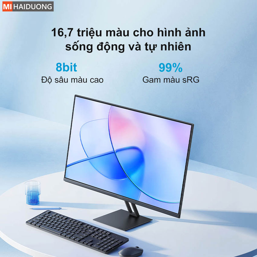 Màn hình máy tính Xiaomi A27i mang đến trải nghiệm thị giác ấn tượng với khả năng hiển thị lên đến 16.7 triệu màu, giúp tái hiện hình ảnh sống động và tự nhiên. Độ sâu màu 8-bit cho khả năng chuyển màu mượt mà, hạn chế hiện tượng phân tầng, đảm bảo mọi chi tiết hiển thị liền mạch và chân thực. Bên cạnh đó, màn hình đạt chuẩn gam màu sRGB 99%, giúp tăng cường độ chính xác màu sắc, mang đến hình ảnh rõ nét từ ảnh tĩnh đến video. Nhờ đó, mọi nội dung đều được thể hiện với màu sắc tươi sáng, rực rỡ, đáp ứng tốt cả nhu cầu làm việc sáng tạo lẫn giải trí.