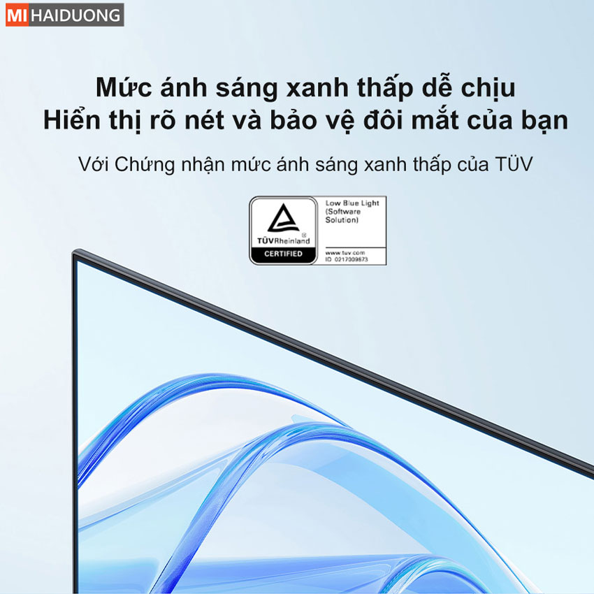 Màn hình máy tính Xiaomi A27i được chứng nhận bởi TÜV về chế độ ánh sáng xanh thấp, giúp giảm thiểu ánh sáng xanh có hại, bảo vệ mắt bạn khi làm việc trong thời gian dài. Chế độ này lọc bớt ánh sáng xanh ngắn sóng, mang lại sự thoải mái và an toàn cho đôi mắt, ngay cả khi bạn làm việc liên tục. Thêm vào đó, công nghệ DC dimming của màn hình còn giảm thiểu hiện tượng nhấp nháy, giúp bảo vệ mắt tốt hơn, mang đến trải nghiệm làm việc dễ chịu và an toàn hơn.
