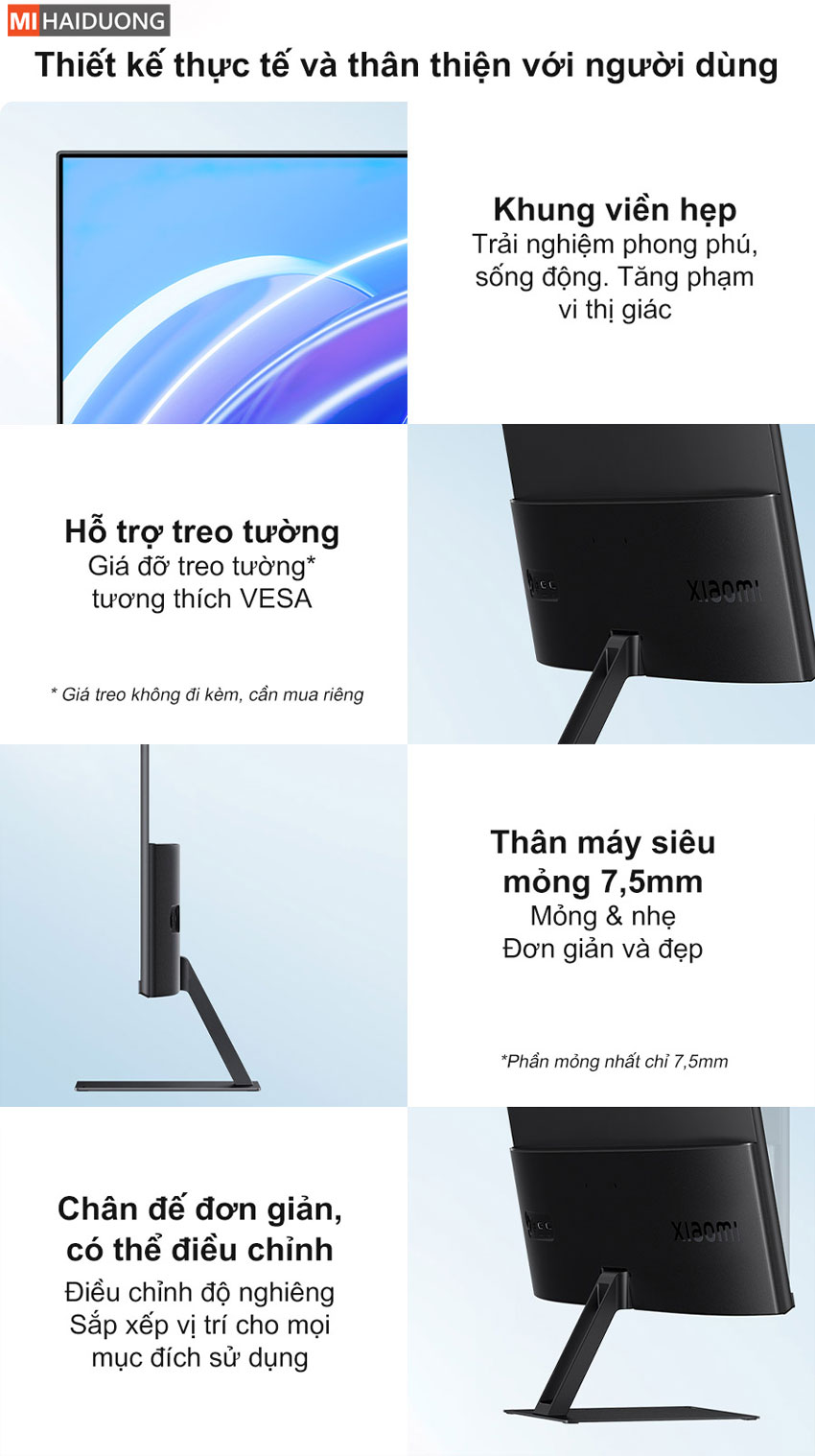 Màn hình máy tính Xiaomi A27i gây ấn tượng với thân máy siêu mỏng chỉ 7.5mm, mang đến vẻ ngoài thanh lịch và hiện đại, phù hợp với mọi không gian làm việc. Sản phẩm hỗ trợ treo tường chuẩn VESA, giúp tiết kiệm diện tích và linh hoạt trong lắp đặt (lưu ý: giá treo tường không đi kèm). Bên cạnh đó, chân đế được thiết kế tối giản nhưng vẫn dễ dàng điều chỉnh góc nghiêng, đáp ứng nhiều nhu cầu sử dụng khác nhau. Tất cả những chi tiết này đều hướng đến sự tiện lợi và thoải mái, giúp nâng cao trải nghiệm người dùng trong quá trình làm việc và giải trí.