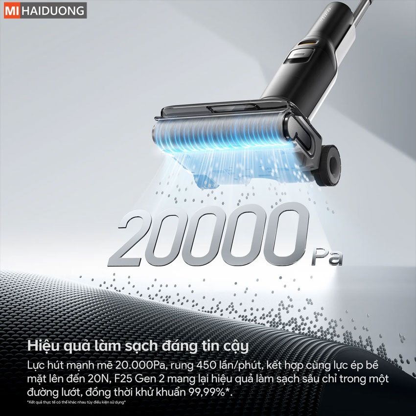 • Lực hút cực mạnh 20.000Pa: Xử lý gọn gàng mọi loại vết bẩn cứng đầu chỉ trong một lần lướt.
