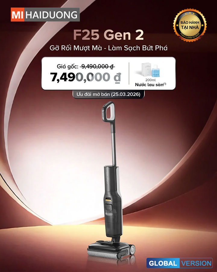 Máy hút bụi lau nhà Roborock F25 Gen 2 gây ấn tượng với lực hút mạnh mẽ lên đến 20.000Pa, giúp loại bỏ bụi bẩn và mảnh vụn hiệu quả trên nhiều bề mặt. Thiết kế lau sát viền chính xác kết hợp hệ thống chống rối tóc thông minh mang lại khả năng làm sạch toàn diện, hạn chế tối đa việc phải vệ sinh thủ công. Sản phẩm còn được trang bị tính năng tự động giặt và sấy con lăn bằng nhiệt độ cao, giúp duy trì độ sạch khuẩn tối ưu sau mỗi lần sử dụng. Với thiết kế mỏng nhẹ, đầu máy linh hoạt cùng thời lượng hoạt động lên đến 60 phút, Roborock F25 Gen 2 mang đến trải nghiệm dọn dẹp nhanh chóng, tiện lợi và hiệu quả hơn mỗi ngày.