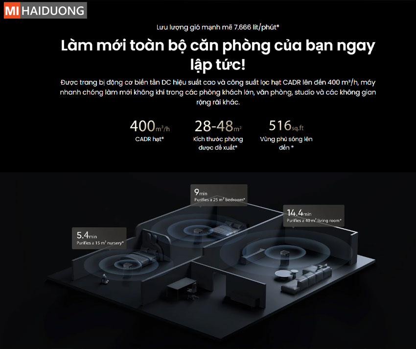 - Hiệu suất làm sạch mạnh mẽ cho không gian lớn với lưu lượng gió 7.666 lít/phút