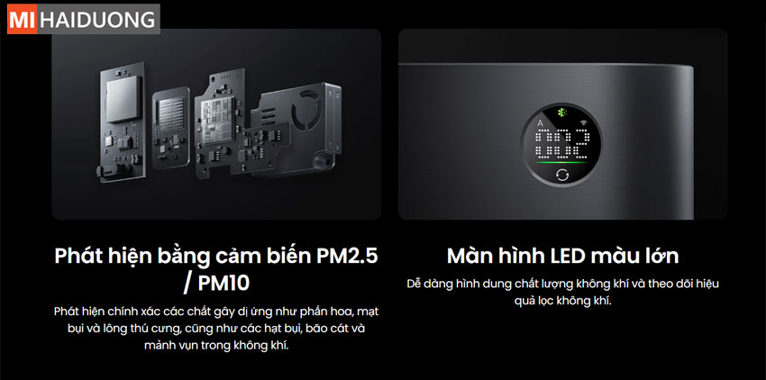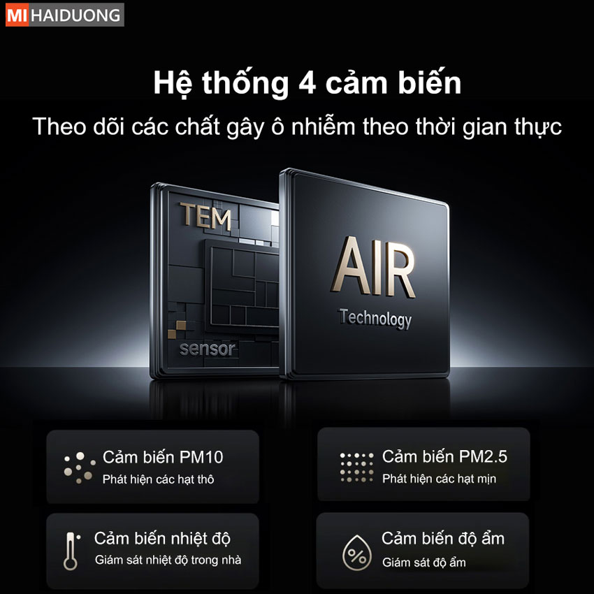 - Hệ thống 4 cảm biến PM2.5, PM10, nhiệt độ, độ ẩm cùng khả năng hiển thị trực quan