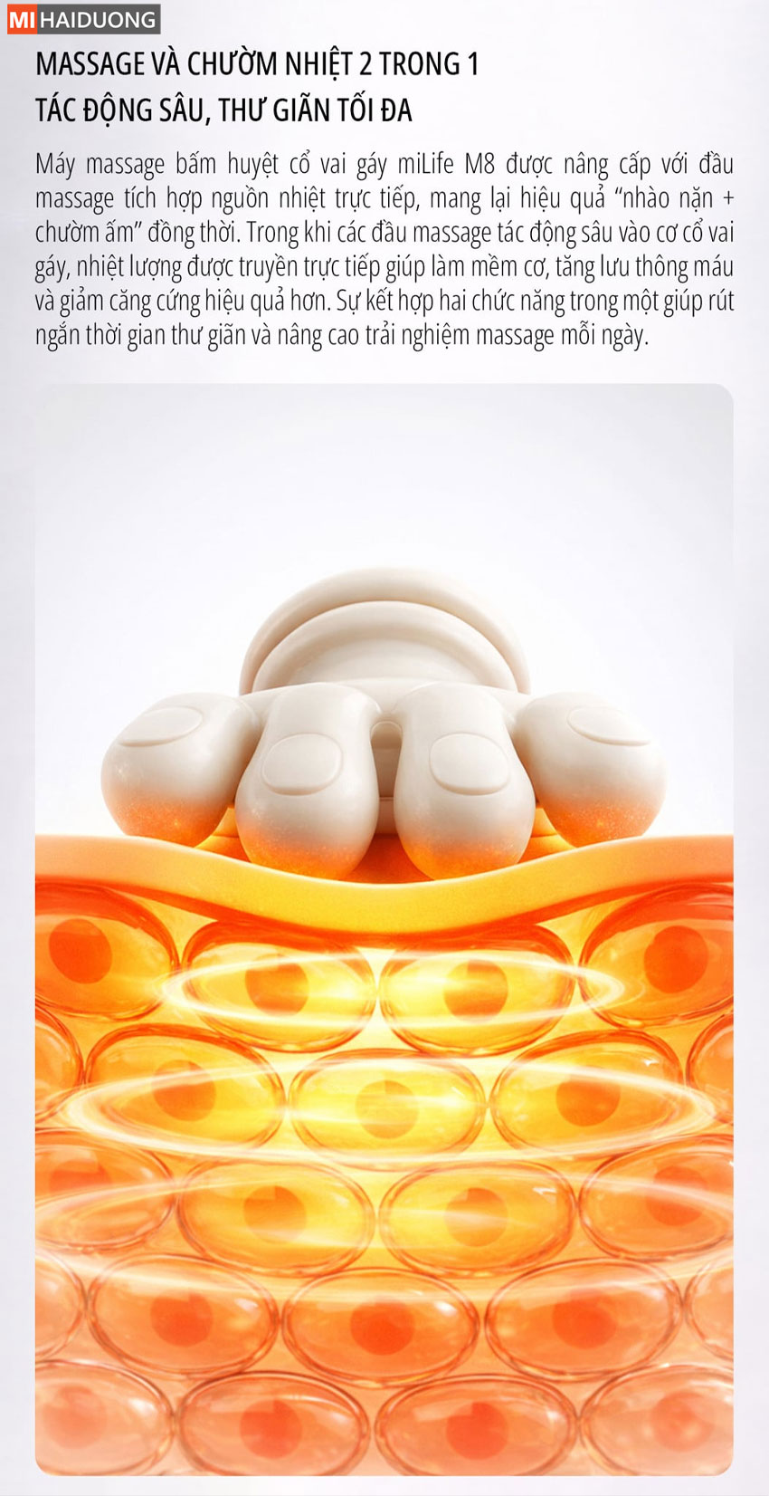Máy massage bấm huyệt cổ vai gáy miLife M8 cơ chế “song chưởng” áp sát da, kết hợp chườm nhiệt ánh sáng đỏ giúp làm ấm sâu vùng cổ vai gáy. Công nghệ dẫn nhiệt hai vùng mô phỏng chính xác hơi ấm từ lòng bàn tay, ôm sát cổ và duy trì nhiệt độ ổn định trong suốt quá trình sử dụng. Nhờ đó, cơ cổ được thư giãn tốt hơn, giảm cảm giác căng cứng và mang lại sự dễ chịu rõ rệt sau mỗi lần massage.