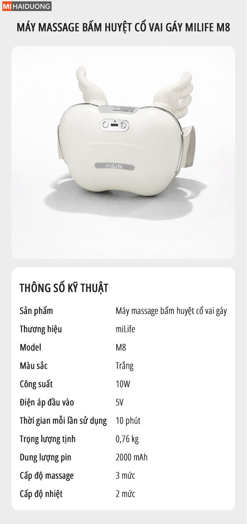 Máy mát xa hồng ngoại miLife M8 là dòng máy massage cổ vai gáy với 3 chế độ bóp khác nhau, chườm nóng 2 cấp 42 và 45 độ, nâng cấp mô phỏng bàn tay người 4D với đầu bàn tay silicon mềm mại, kích thước nhỏ gọn với thời lượng pin 12 ngày dùng, thiết kế mới hình bàn tay với 10 ngón tay là 10 đầu massage.