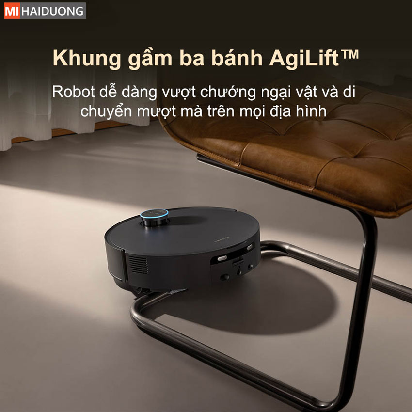 Dreame Aqua 10 Pro Track được trang bị hệ thống khung gầm AgiLift™ có thể điều chỉnh ba bánh xe độc lập để vượt qua các chướng ngại vật một cách tự động. Đó là do phần khung gầm của Dreame 10 Pro Track sở hữu một bánh xe đa hướng và hai bánh xe dẫn động có thể điều chỉnh độc lập để Dreame 10 Pro Track vượt qua gờ cửa cao 1,5cm chỉ bằng độ cao gầm xe, hoặc nâng hạ kết hợp với bánh dẫn động để Dreame 10 Pro Track vượt qua chướng ngại vật từ 15mm đến 30mm. Trong quá trình làm việc, khi Dreame Aqua 10 Pro Track gặp thảm, hệ thống gầm AgiLift™ giúp Dreame 10 Pro Track tự nâng khung gầm lên cao hơn, tránh làm ướt thảm sợi ngắn, đồng thời Dreame Aqua 10 Pro Track vẫn duy trì được lực hút và tốc độ di chuyển. Đối với chướng ngại vật như gờ cửa đôi cao 3cm, Dreame Aqua 10 Pro Track tự động đẩy bánh dẫn động xuống, xoay và nâng khung gầm, để nó có thể vượt qua mà không bị kẹt. Nhờ AgiLift™, Dreame 10 Pro Track có thể chuyển đổi linh hoạt giữa các khu vực: từ phòng khách sang bếp, từ phòng tắm sang ban công, mà không bị gián đoạn công việc do địa hình giữa các căn phòng.