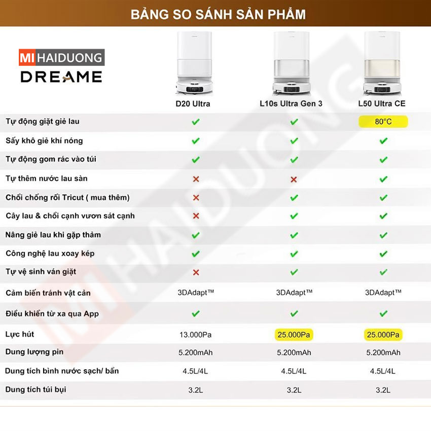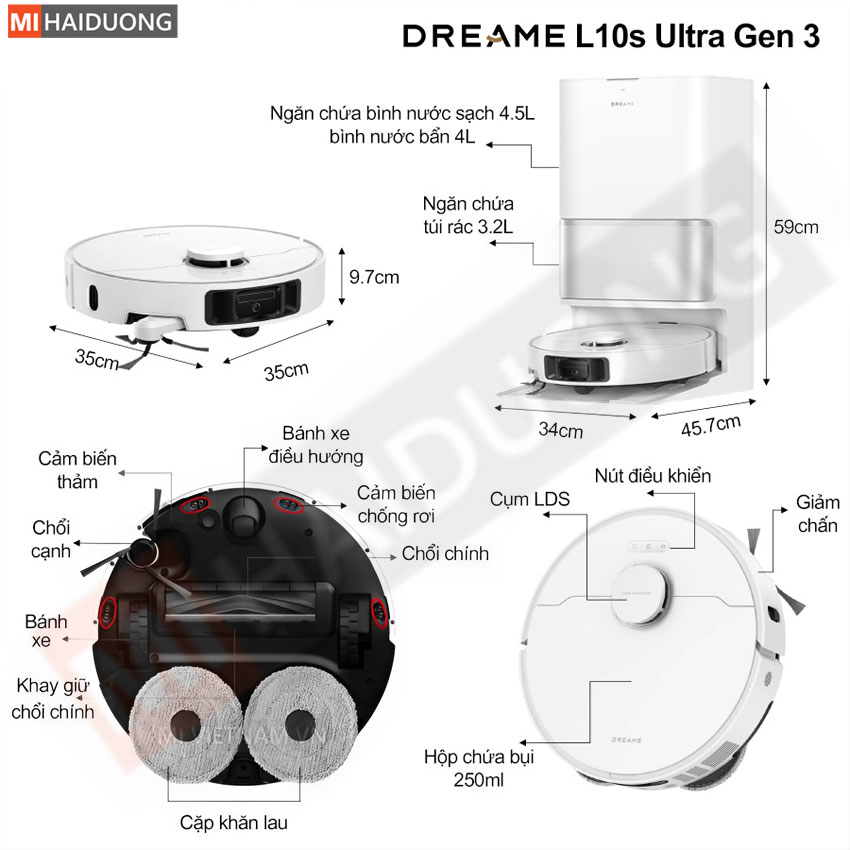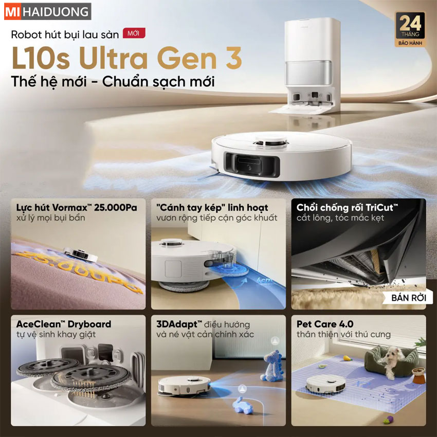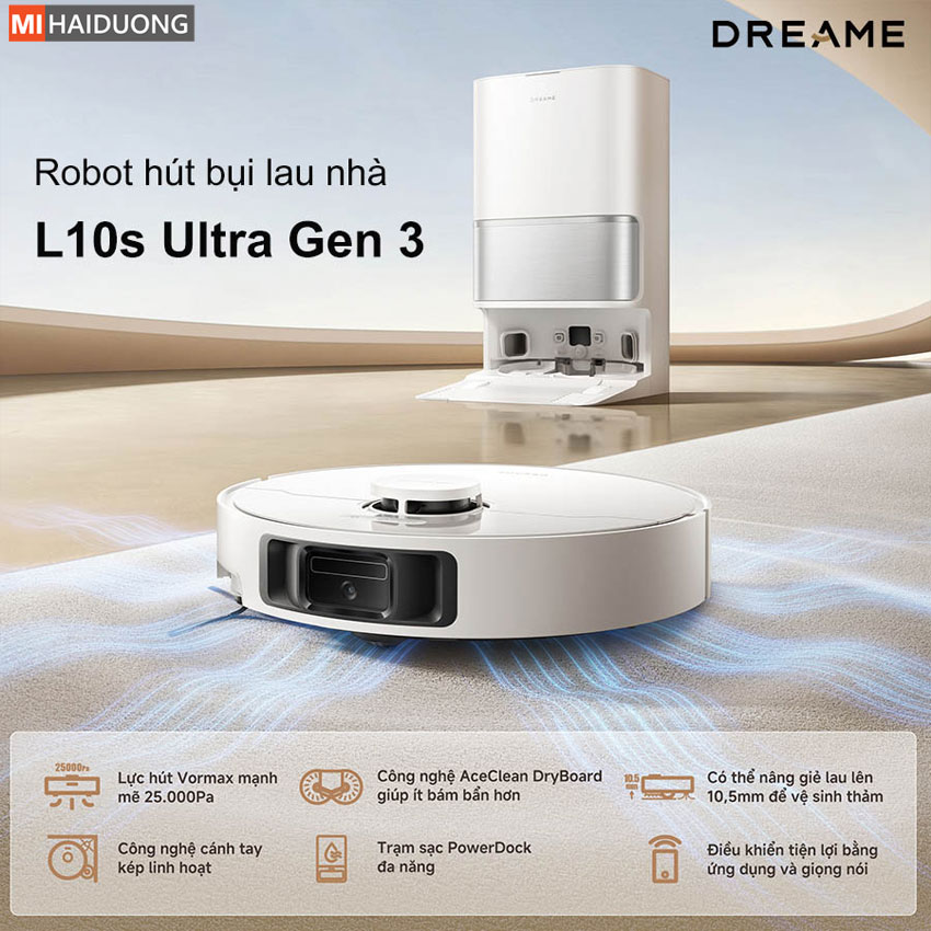 Robot hút bụi lau nhà Dreame L10s Ultra Gen 3 là robot hút bụi lau nhà thế hệ mới, được thiết kế để mang lại trải nghiệm dọn dẹp tự động toàn diện và vượt trội. Với lực hút Vormax™ lên đến 25.000Pa từ động cơ TurboForce thế hệ 6, sản phẩm dễ dàng loại bỏ bụi bẩn, lông thú cưng và mảnh vụn lớn trên sàn cứng lẫn thảm. Công nghệ SideReach™ mở rộng chổi cạnh 4cm, kết hợp MopExtend™ RoboSwing cho giẻ lau xoay linh hoạt, đảm bảo làm sạch sát góc cạnh lên đến 99%. Hệ thống lau sàn DuoScrub™ với hai giẻ xoay tốc độ cao và 32 cấp độ ẩm giúp xử lý vết bẩn cứng đầu hiệu quả. Chổi TriCut 2.0 chống rối tóc 0%, cùng cảm biến siêu âm nâng giẻ lau 10,5mm khi gặp thảm, hỗ trợ làm sạch chuyên sâu. Chắc chắn Dreame L10s Ultra Gen 3 sẽ là một người bạn hàng ngày, giúp bạn xử lý mọi công việc về lau dọn nhà cửa một cách hoàn hảo nhất.