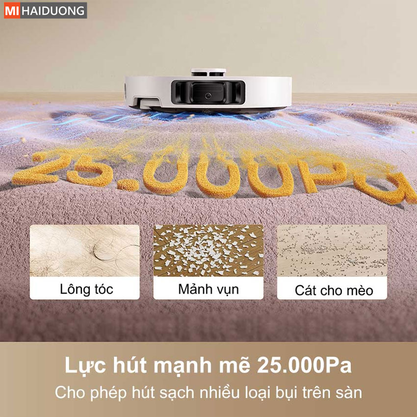Lực hút mạnh mẽ 25.000Pa hút sạch bụi bẩn trong một lần di chuyển