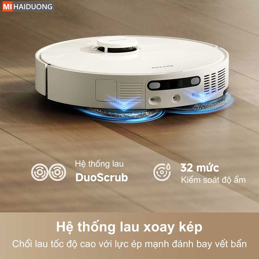 Robot hút bụi lau nhà Dreame L10s Ultra Gen 3 được trang bị hệ thống lau DuoScrub gồm hai đĩa lau quay tốc độ cao, giúp đánh bay mọi vết bẩn cứng đầu và mang lại sàn khô nhanh, thân thiện với thú cưng. Đặc biệt, công nghệ điều chỉnh độ ẩm 32 cấp độ cho phép robot kiểm soát chính xác lượng nước, từ khô nhẹ, ẩm vừa đến ướt kỹ, phù hợp với từng loại sàn khác nhau. Nhờ đó, sàn gỗ không bị thấm nước, gạch men được làm sạch sâu, còn thảm luôn khô ráo như mới.