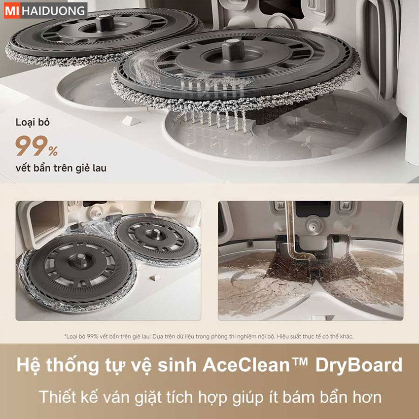 - Tự động giặt và sấy khô giẻ lau: Sau mỗi phiên làm sạch, robot sẽ quay về trạm để tự động giặt giẻ lau bằng công nghệ AceClean™. Tiếp đó, trạm sẽ sấy khô giẻ lau bằng khí nóng, ngăn ngừa hiệu quả sự phát triển của vi khuẩn, nấm mốc và mùi hôi khó chịu.