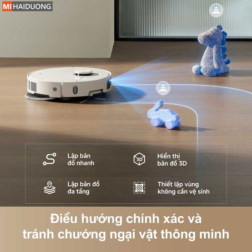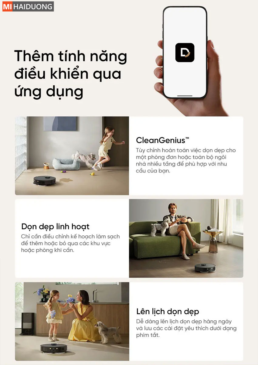 - CleanGenius™: Tính năng này cho phép robot tự động phân tích bố cục phòng, loại sàn và vị trí nội thất để đề xuất chế độ làm sạch phù hợp nhất.
