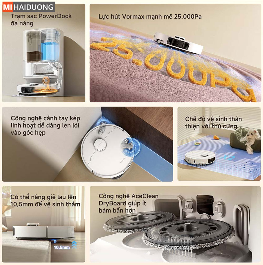 - Động cơ Vormax với lực hút 25.000Pa hút sạch mọi bụi bẩn