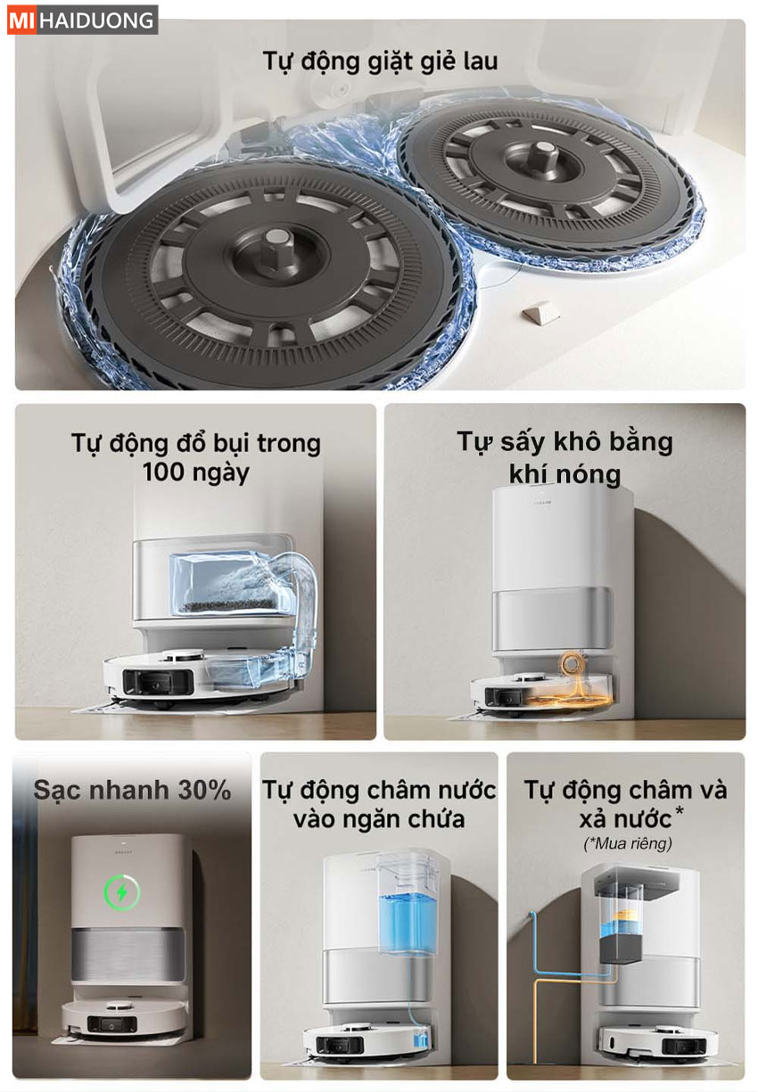 - Tự động thêm nước và dung dịch lau sàn: Trạm sạc có ngăn chứa nước sạch 4,5L và nước bẩn 4L. Nó sẽ tự động bơm nước sạch vào ngăn chứa của robot để đảm bảo giẻ lau luôn được cấp ẩm đầy đủ. Ngoài ra, trạm còn có khả năng tự động thêm dung dịch lau sàn (bán riêng), giúp không gian sống luôn sạch sẽ và thơm mát.