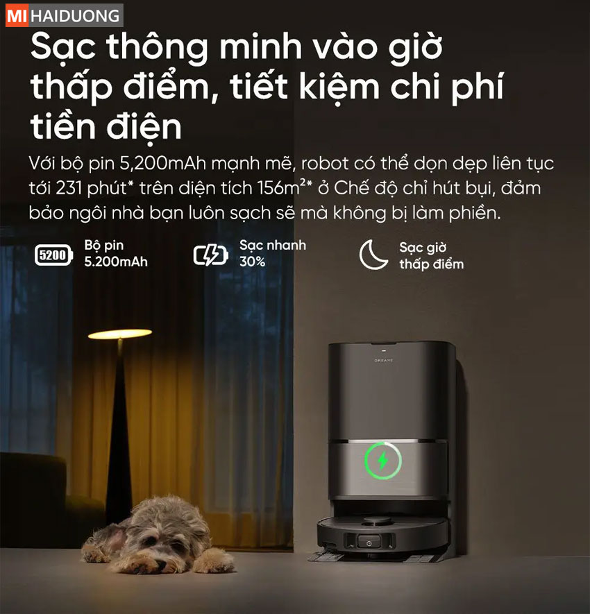 Sở hữu pin dung lượng lớn 5.200mAh, robot hút bụi lau nhà Dreame L10s Ultra Gen 3 có thể làm sạch liên tục đến 231 phút, bao phủ diện tích lên tới 156m² chỉ trong một lần sạc. Ngoài ra, tính năng sạc nhanh và sạc vào giờ thấp điểm giúp tiết kiệm điện năng, giảm chi phí sử dụng trong thời gian dài.