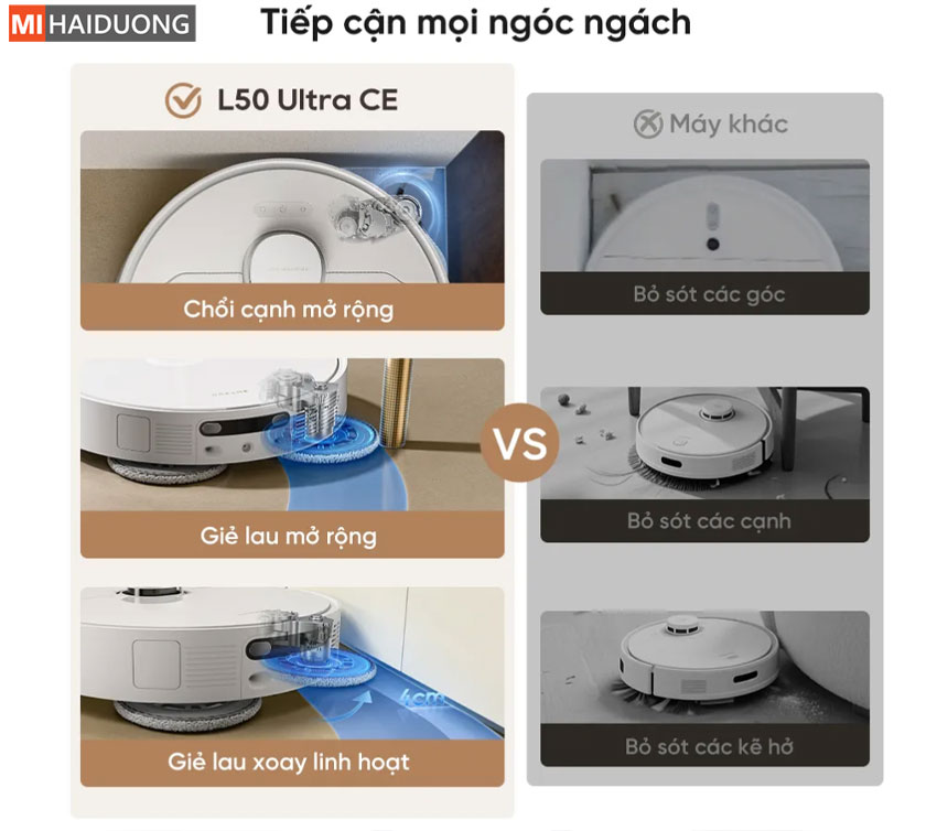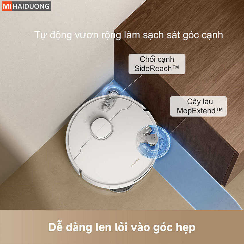 Ứng dụng công nghệ SideReach™ và MopExtend™ RoboSwing, robot hút bụi lau nhà Dreame L50 Ultra CE có khả năng vươn rộng tấm lau và đầu hút để tiếp cận mọi ngóc ngách, từ chân bàn cong, gầm tủ thấp đến kẽ hẹp sát tường. Robot có thể lau sát chỉ còn vài mm kẽ hở, đảm bảo làm sạch tới 99% bề mặt góc cạnh, nơi mà hầu hết các robot khác thường bỏ sót. Đây chính là ưu thế vượt trội giúp Dreame L50 Ultra CE trở thành chuyên gia diệt bụi thực thụ trong mọi không gian.
