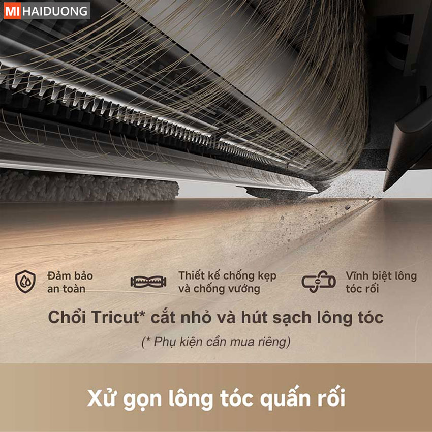 Không còn cảnh phải gỡ tóc khỏi chổi sau mỗi lần dọn dẹp, robot hút bụi lau nhà Dreame L50 Ultra CE có thể lắp đặt chổi TriCut™ chống rối thông minh, có khả năng cắt nhỏ và hút sạch tóc, lông thú ngay trong quá trình làm việc. Thiết kế chống kẹp và chống vướng giúp robot vận hành trơn tru, đảm bảo 0% tình trạng rối tóc, mang lại sự tiện lợi và an toàn tuyệt đối cho người dùng. (*Phụ kiện chổi Tricut cần mua riêng, không có sẵn trong hộp)