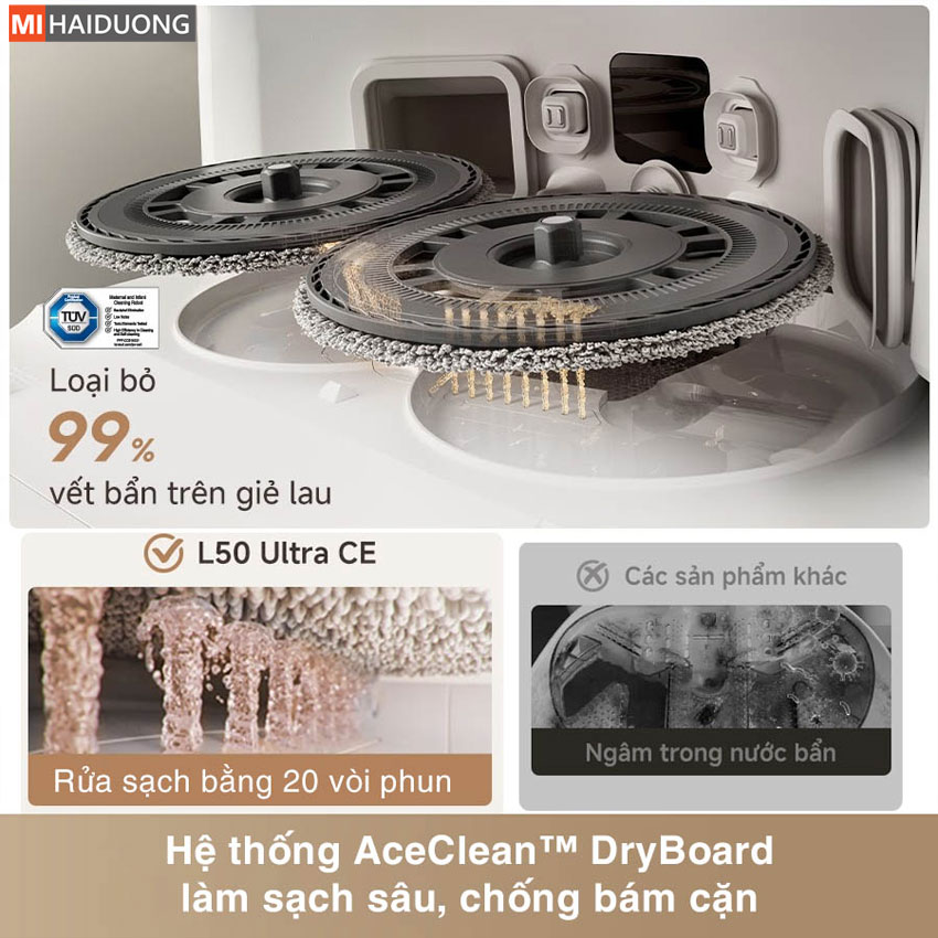 Khác biệt hoàn toàn so với các trạm giặt truyền thống, hệ thống AceClean™ DryBoard của Dreame L50 Ultra CE được thiết kế với bề mặt phẳng chống bám cặn, cho phép quá trình rửa giẻ và xả nước bẩn diễn ra khép kín. Nhờ vậy, dock luôn sạch bóng, không đọng nước, không mùi, giảm đáng kể công việc vệ sinh thủ công của người dùng. Đây chính là bí quyết giúp robot luôn vận hành ổn định, bền bỉ và giữ hiệu quả làm sạch tối ưu qua thời gian.