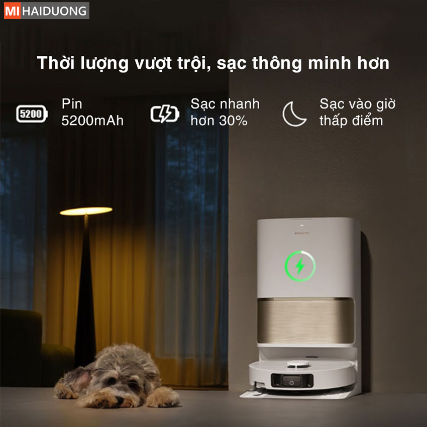 Sở hữu viên pin dung lượng lớn 5.200mAh, robot hút bụi lau nhà Dreame L50 Ultra CE có thể hoạt động liên tục tới 231 phút, bao phủ diện tích lên đến 156m² chỉ trong một lần sạc, đặc biệt ở chế độ hút yên tĩnh. Không chỉ mạnh mẽ mà còn tiết kiệm điện, robot hỗ trợ sạc nhanh hơn 30% và tự động sạc vào khung giờ thấp điểm, giúp giảm chi phí năng lượng mà vẫn duy trì hiệu suất tối đa cho mỗi lần vận hành.
