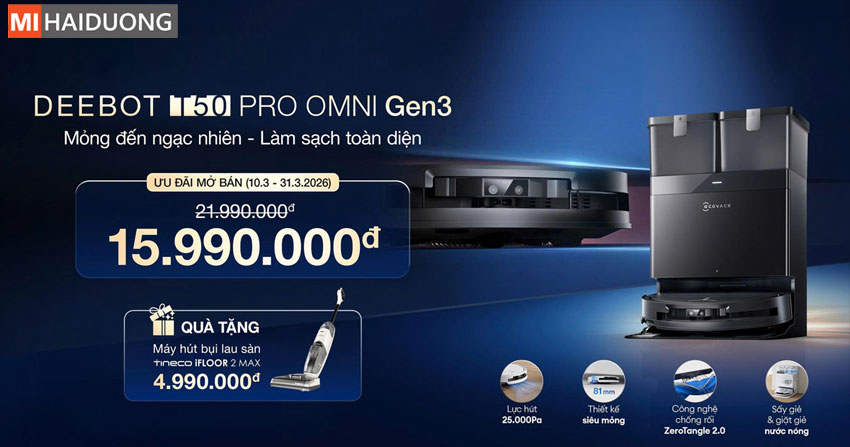 Ecovacs Deebot T50 Pro Omni Gen 3 là thế hệ robot hút bụi lau nhà thông minh mới của Ecovacs, được thiết kế để mang lại trải nghiệm dọn dẹp tự động toàn diện trong không gian sống hiện đại. Sở hữu thân máy siêu mỏng chỉ 81mm, lực hút mạnh mẽ lên đến 25.000 Pa cùng loạt công nghệ AI tiên tiến, robot không chỉ làm sạch hiệu quả mà còn tối ưu khả năng điều hướng và tự động hóa quy trình vệ sinh. Kết hợp trạm OMNI đa năng tự động giặt sấy và đổ rác, Ecovacs Deebot T50 Pro Omni Gen 3 giúp việc chăm sóc sàn nhà trở nên nhẹ nhàng, tiện lợi và tiết kiệm thời gian hơn bao giờ hết.
