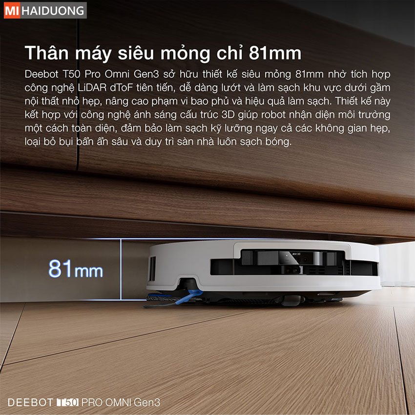 Robot hút bụi Ecovacs Deebot T50 Pro Omni Gen 3 gây ấn tượng với thiết kế thân máy siêu mỏng chỉ 81mm nhờ tích hợp hệ thống LiDAR dToF thế hệ mới. Kích thước tối ưu này giúp robot dễ dàng len lỏi và làm sạch triệt để dưới gầm giường, gầm sofa hay các khu vực nội thất thấp. Đây vốn là những góc khuất thường tích tụ rất nhiều bụi bẩn nhưng lại cực kỳ khó tiếp cận bằng các phương pháp dọn dẹp thông thường.