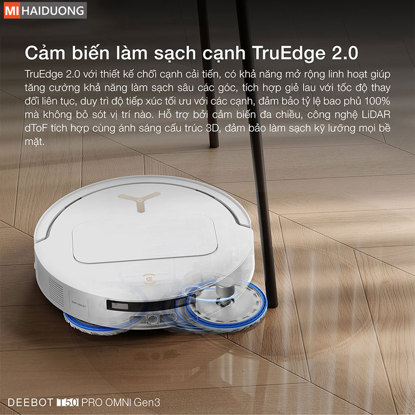 Công nghệ TruEdge 2.0 trên Robot hút bụi lau nhà Ecovacs Deebot T50 Pro Gen 3 là một hệ thống làm sạch cạnh thích ứng được cải tiến đáng kể so với thế hệ trước. TruEdge 2.0 kết hợp giữa chổi quét ven cải tiến có khả năng mở rộng linh hoạt và giẻ lau đôi xoay biên thiên liên tục, cho phép robot tiếp cận sát tới các góc tường và đường viền sàn nhà với khoảng cách chỉ 1mm. Hệ thống được hỗ trợ bởi bộ cảm biến đa chiều gồm LiDAR dToF tích hợp đầy đủ, ánh sáng cấu trúc 3D và camera RGB. Sự phối hợp này tạo nên một quy trình làm sạch cạnh thích ứng đảm bảo độ phủ 100% mà không bỏ sót bất kỳ khu vực nào, dù là góc tường hay vùng tiếp giáp với chân tủ. Đây là một trong những điểm mạnh giúp T50 Pro Gen 3 vượt trội trong việc làm sạch triệt để trên mọi loại bề mặt.