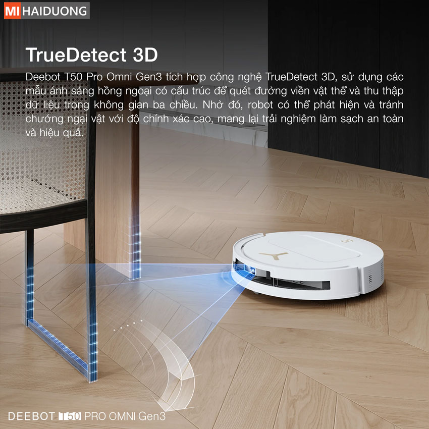 Ecovacs T50 Pro Gen 3 được trang bị công nghệ nhận diện thông minh TrueDetect 3D theo phương pháp OMNI-approach, được hỗ trợ bởi mô hình ngôn ngữ thị giác (VLM – Vision Language Model). Công nghệ tiên tiến này cho phép robot nhận diện và xác định chướng ngại vật trong thời gian thực, đồng thời sử dụng đường viền của các vật thể làm ranh giới để thực hiện làm sạch cạnh. Điểm nổi bật của TrueDetect 3D là các mô-đun ánh sáng cấu trúc và hình ảnh hoạt động đồng thời, đảm bảo giám sát liên tục các ranh giới đã xác định trong suốt quá trình vận hành. Robot hút bụi lau nhà Ecovacs Deebot T50 Pro Gen 3 nhờ đó có thể làm sạch sát các chướng ngại vật mà không bỏ qua hoàn toàn, tối đa hóa phạm vi bao phủ và độ chính xác khi làm sạch, mang lại trải nghiệm không bị gián đoạn.