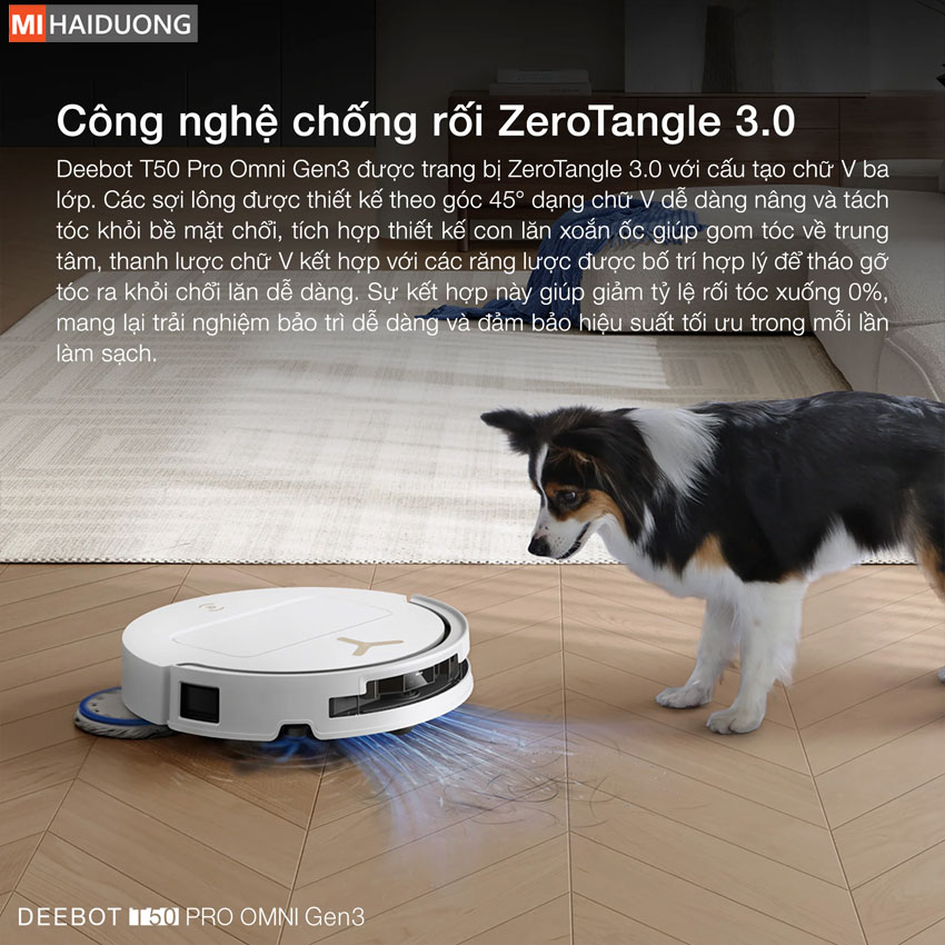 Một trong những vấn đề phổ biến nhất với robot hút bụi là tóc và sợi chỉ bị rối quanh chổi chính, làm giảm hiệu suất và đòi hỏi vệ sinh thường xuyên. Ecovacs Deebot T50 Pro Gen 3 giải quyết triệt để vấn đề này bằng công nghệ ZeroTangle 3.0 với cấu trúc chổi gỡ rối tóc ba lớp hình chữ V. Cụ thể, cấu trúc chổi ZeroTangle 3.0 bao gồm: sợi lông gỡ rối thiết kế hình chữ V góc 45°, thân chổi xoắn ốc hình chữ V giúp gom tóc vào giữa và răng lược hình chữ V có nhiệm vụ gỡ rối hiệu quả. Kết hợp ba lớp thiết kế này, tỷ lệ tóc bị rối vào chổi của T50 Pro Gen 3 giảm xuống còn gần 0%, giúp bảo trì sau khi vệ sinh sàn trở nên dễ dàng hơn rất nhiều và đảm bảo hiệu suất hoạt động không bị gián đoạn theo thời gian.