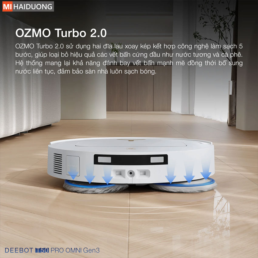Công nghệ OZMO Turbo 2.0 trên Robot hút bụi lau nhà Ecovacs Deebot T50 Pro Gen 3 được thiết kế với hai tấm giẻ lau xoay tốc độ cao cùng công nghệ làm sạch năm lớp. Hệ thống này đặc biệt hiệu quả trong việc loại bỏ các vết bẩn cứng đầu như nước tương, cà phê hay dầu mỡ vương trên sàn gạch hoặc sàn gỗ. Ngoài ra, OZMO Turbo 2.0 liên tục bổ sung nước trong suốt quá trình lau, đảm bảo giẻ lau luôn đủ ẩm để làm sạch sàn nhà hiệu quả từ đầu đến cuối hành trình làm việc.