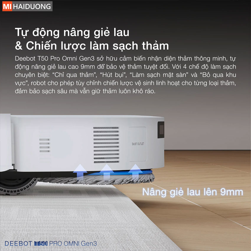 Robot hút bụi Ecovacs Deebot T50 Pro Omni Gen 3 sở hữu cảm biến nhận diện thảm siêu nhạy kết hợp thuật toán làm sạch thông minh, cho phép định vị chính xác vị trí và kích thước thảm trong tích tắc. Khi tiếp cận khu vực này, robot sẽ tự động nâng giẻ lau lên độ cao 9mm, giúp ngăn chặn tuyệt đối tình trạng làm ướt hoặc gây hư hại đến chất liệu thảm cao cấp.