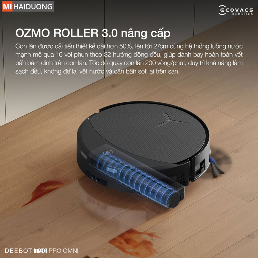 Chi tiết hơn, trong quá trình làm việc, con lăn của Ecovacs Deebot T90 Pro Omni quay với tốc độ lên đến 200 vòng/phút, kết hợp lực nhấn 3.800Pa và con lăn nylon mật độ cao, giúp sàn nhà được làm sạch đồng đều, khô nhanh, không để lại vệt nước hay ô nhiễm thứ cấp – mang đến trải nghiệm dọn dẹp rảnh tay, hiệu quả và tinh gọn.