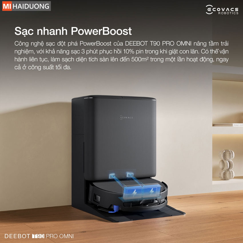 Công nghệ sạc nhanh PowerBoost trên Ecovacs Deebot T90 Pro Omni mang đến trải nghiệm làm sạch liền mạch, ổn định với khả năng nạp năng lượng siêu tốc, hạn chế tình trạng hết pin giữa chừng. Cụ thể hơn, thuật toán thông minh trên Ecovacs Deebot T90 Pro Omni sẽ tự động tối ưu và phân bổ năng lượng, ưu tiên hoàn thành toàn bộ chu trình dọn dẹp trong một lần vận hành.