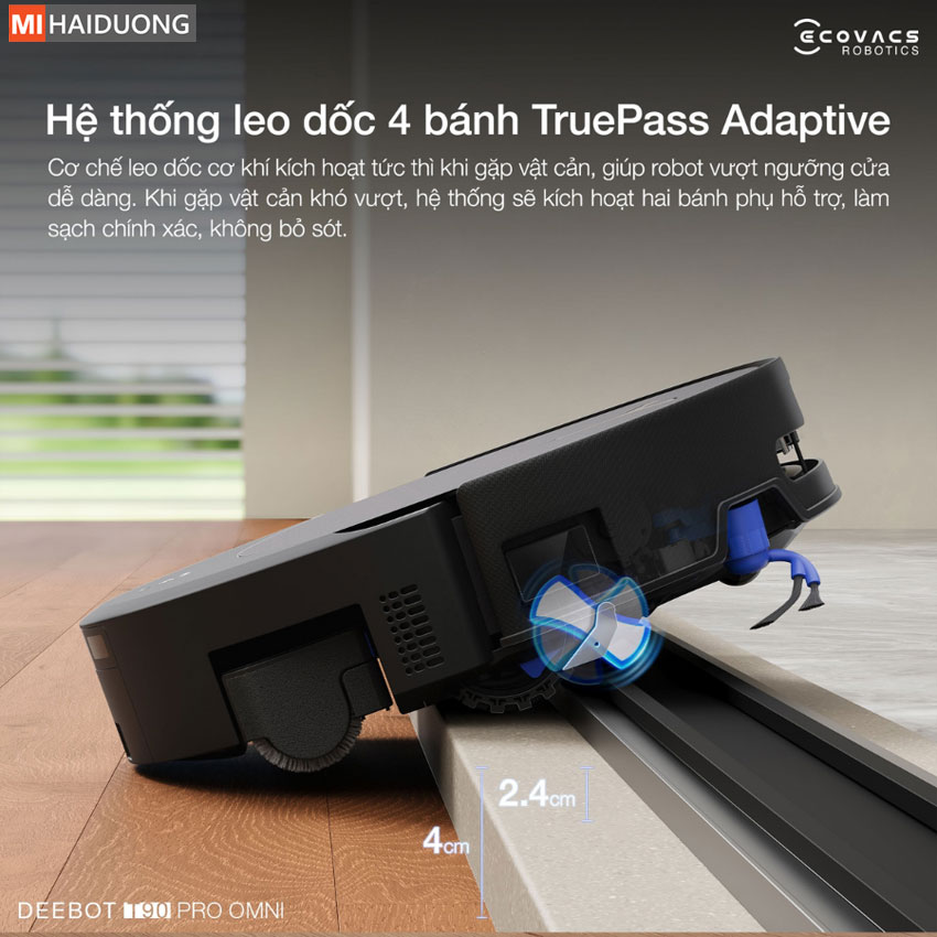 Hệ thống leo trèo thích ứng 4 bánh TruePass trên Ecovacs Deebot T90 Pro Omni ứng dụng cơ chế cơ học tiên tiến. Nhờ đó, robot dễ dàng vượt qua các gờ cửa, chướng ngại vật trong không gian sống. Đặc biệt, khi tiếp xúc vật cản, hai bánh xe đòn bẩy phụ trợ sẽ lập tức kích hoạt, tăng độ bám và lực đẩy.