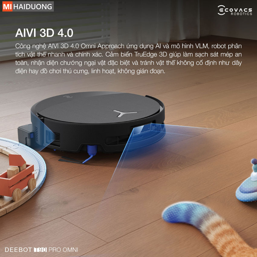 Ecovacs Deebot T90 Pro Omni gây ấn tượng với công nghệ AIVI 3D 4.0 Omni-Approach, được vận hành bởi mô hình thị giác – ngôn ngữ (VLM) và mạng thần kinh học sâu, mang đến khả năng nhận diện vật thể chính xác và phát hiện đường viền chướng ngại ngay lập tức. Cụ thể hơn, hệ thống ánh sáng cấu trúc phía trước kết hợp liền mạch cùng cảm biến cạnh TruEdge 3D, cho phép Ecovacs Deebot T90 Pro Omni làm sạch sát mép tường mà vẫn duy trì khoảng cách an toàn tuyệt đối.
