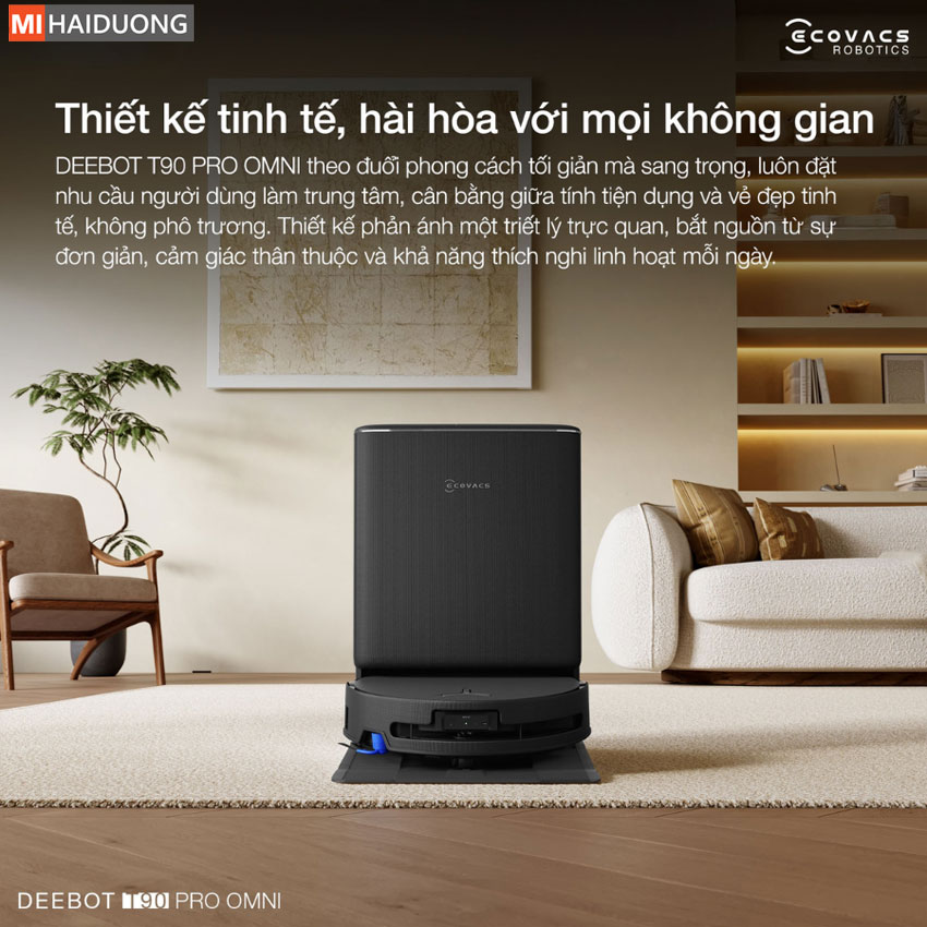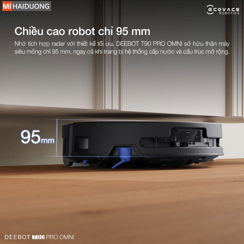 Bên cạnh đó, thiết kế radar được giấu hoàn toàn bên trong thân máy cùng cấu trúc được tối ưu hóa giúp Ecovacs Deebot T90 Pro Omni duy trì độ mỏng chỉ 95 mm. Với thiết kế siêu mỏng này cho phép robot dễ dàng len lỏi vào khu vực gầm thấp để làm sạch sâu, ngay cả khi tích hợp hệ thống làm mới nước và các cơ cấu mở rộng phức tạp.