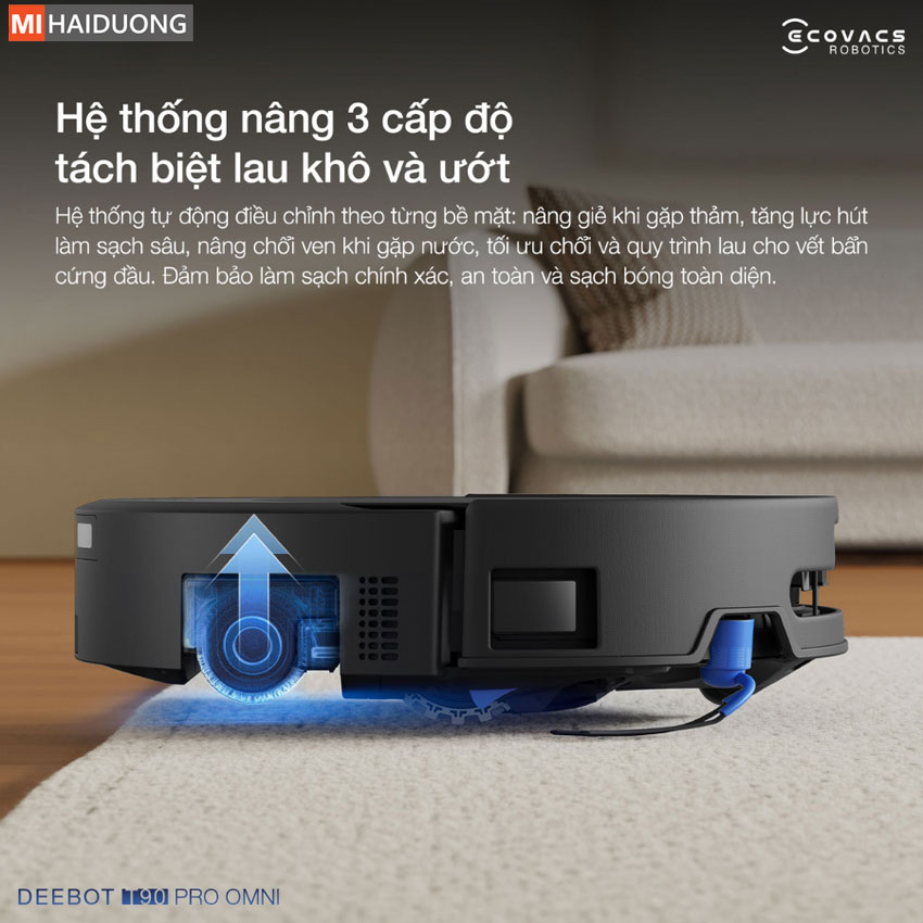 Hệ thống nâng 3 cấp độ trên Ecovacs Deebot T90 Pro Omni mang đến khả năng làm sạch chính xác, đồng thời bảo vệ tối ưu mọi loại sàn trong ngôi nhà bạn.Cụ thể hơn, khi di chuyển trên thảm, con lăn tự động Ecovacs Deebot T90 Pro Omni nâng lên 15 mm để ngăn nước thấm ngược, đồng thời tăng lực hút nhằm làm sạch sâu sợi thảm. Trong trường hợp vết bẩn dạng lỏng, chổi chính và chổi cạnh của Ecovacs Deebot T90 Pro Omni sẽ đồng loạt nâng lên để tránh ô nhiễm chéo.
