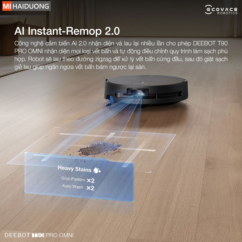 Trường hợp vết bẩn cứng đầu: Ecovacs Deebot T90 Pro Omni sẽ kích hoạt chế độ lau lại chuyên sâu (Deep Re-mop Mode). Quy trình này được thực hiện hai lượt lau đan chéo theo dạng lưới, đồng thời giặt giẻ bằng dung dịch làm sạch chuyên dụng nhằm loại bỏ triệt để vết bẩn và ngăn ngừa lây nhiễm chéo sang các khu vực xung quanh.