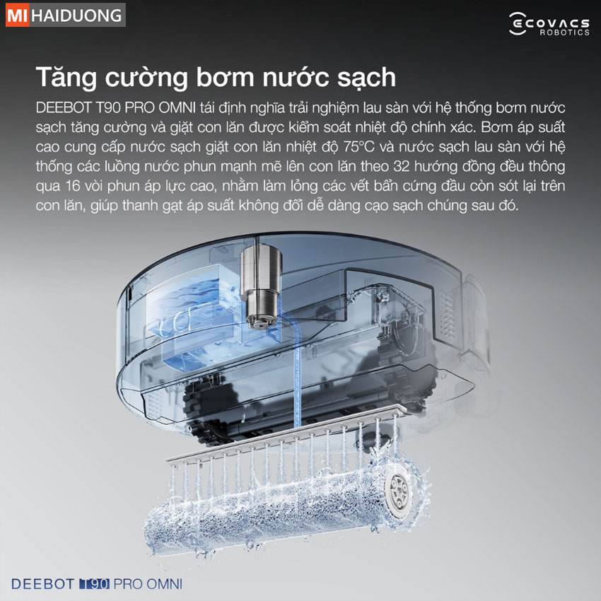 Trạm sạc Ecovacs Deebot T90 Pro Omni đã tạo ra một chuẩn mực mới cho vệ sinh sàn nhà với hệ thống giặt con lăn Fresh-Flow Power Washing. Đây là hệ thống giặt được ứng dụng công nghệ kiểm soát nhiệt độ tiên tiến nhất. Khác biệt hoàn toàn so với phương pháp truyền thống tái sử dụng nước bẩn, hệ thống sử dụng bơm áp suất cao dẫn nước sạch được làm nóng đến 75°C, phun đều 32 tia nước thông qua 16 vòi áp lực cao, giúp làm mềm và loại bỏ triệt để các vết bẩn bám sâu trên con lăn.
