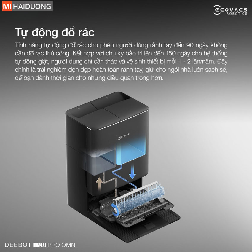 Không chỉ tự động thêm dung dịch làm sạch, Ecovacs Deebot T90 Pro Omni còn giúp việc vệ sinh trở nên nhẹ nhàng nhờ công nghệ tự động đổ rác tiên tiến. Toàn bộ bụi bẩn được làm sạch khỏi hộp bụi ngay sau mỗi chu trình dọn dẹp, cho phép bạn quên việc đổ rác suốt đến 90 ngày.