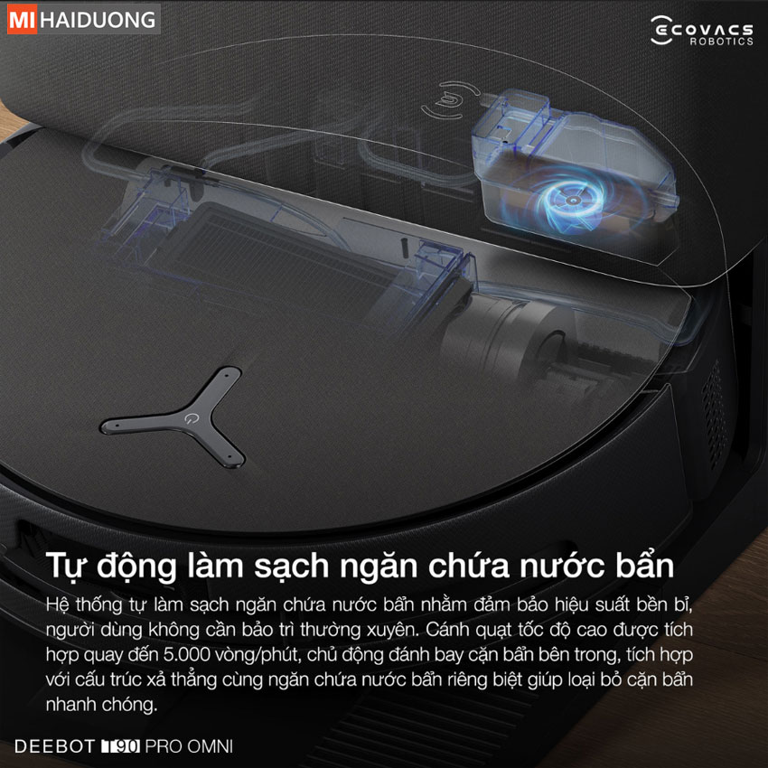 Ecovacs Deebot T90 Pro Omni được trang bị công nghệ tự động vệ sinh hộp nước thải, giúp duy trì hiệu suất vận hành ổn định mà không cần bảo trì thường xuyên. Trọng tâm của hệ thống là cánh quạt tích hợp quay đến 5.000 vòng/phút, chủ động đánh tan cặn bẩn bám dính. Đồng thời, kết hợp cùng thiết kế thoát nước thẳng đứng và máng nước thải độc lập, mang đến cho Ecovacs Deebot T90 Pro Omni khả năng loại bỏ bùn đất nhanh chóng, triệt để.