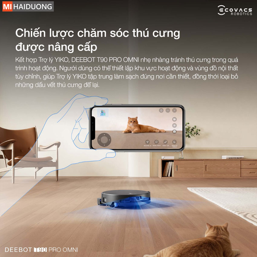 Sự kết hợp giữa AGENT YIKO và hệ thống cảm biến tiên tiến mang đến giải pháp chăm sóc thú cưng thông minh và tinh tế. Ecovacs Deebot T90 Pro Omni di chuyển êm ái để tránh làm phiền vật nuôi, đồng thời cho phép thiết lập vùng làm sạch chuyên sâu nhằm xử lý triệt để lông rụng và vết bẩn, giữ cho không gian sống luôn sạch sẽ, trong lành và hài hòa cho cả gia đình.