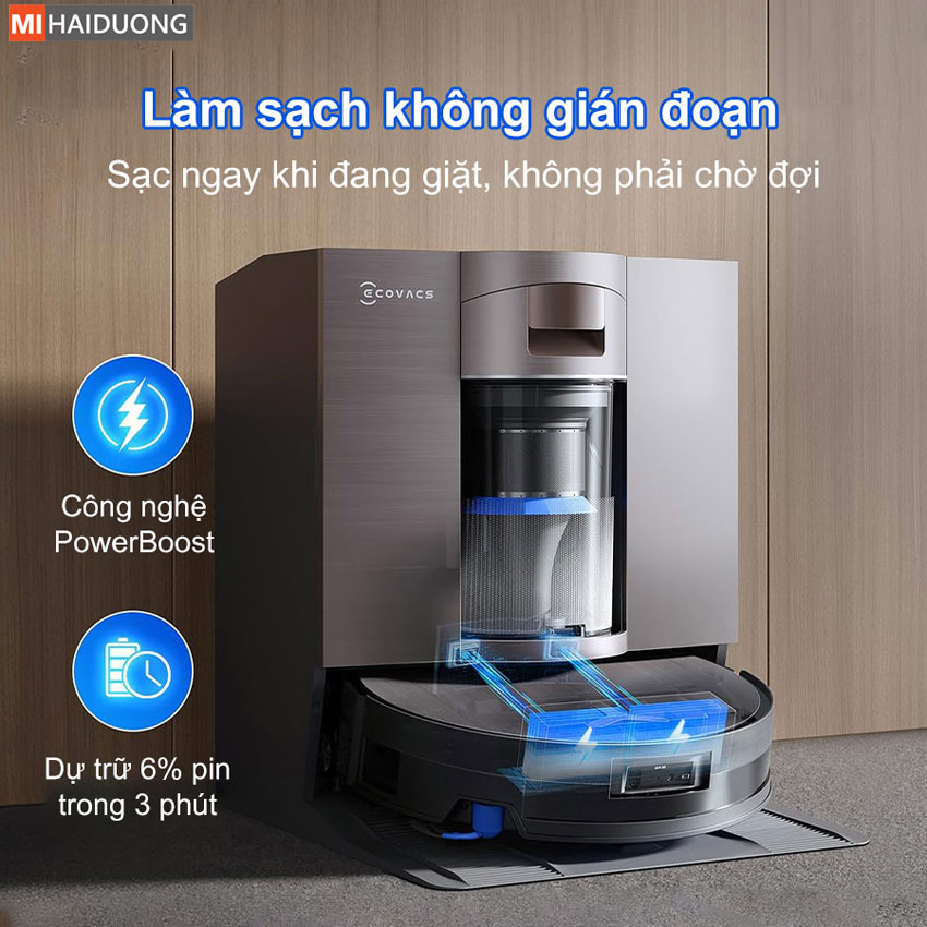 Robot hút bụi lau nhà Ecovacs Deebot X11 Omni Cyclone được trang bị công nghệ PowerBoost đột phá, cho phép robot làm việc mượt mà và hiệu quả hơn bao giờ hết. Nhờ khả năng nạp năng lượng siêu nhanh, robot có thể khôi phục 6% pin chỉ trong 3 phút ngay trong mỗi chu kỳ giặt con lăn thông thường. Kết hợp cùng thuật toán tự tối ưu thông minh, robot tự động phân bổ pin để hoàn thành việc làm sạch toàn bộ không gian một cách linh hoạt, giảm thiểu tối đa thời gian chờ.