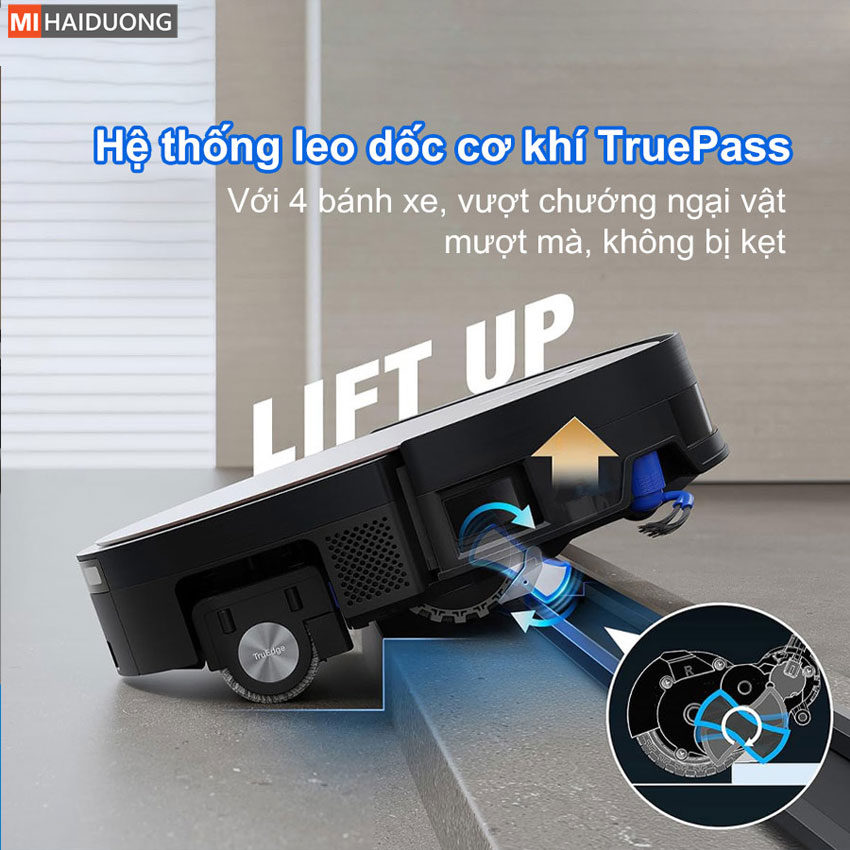 Robot hút bụi lau nhà Ecovacs Deebot X11 OmniCyclone được nâng cấp với hệ thống leo dốc cơ khí 4 bánh TruePass, mang lại khả năng di chuyển mạnh mẽ và ổn định hơn bao giờ hết. Khi gặp ngưỡng cửa hay chướng ngại vật, robot lập tức kích hoạt hai bánh phụ trợ với răng bám cao su mềm, giúp tăng độ bám và nâng cao khả năng vượt chướng ngại.