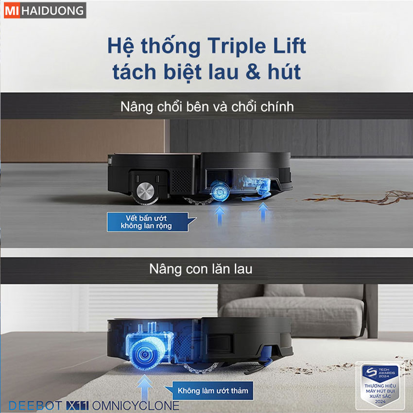 Hệ thống Triple Lift là một trong những cải tiến đột phá của Ecovacs X11 Omni Cyclone, cho phép robot linh hoạt xử lý từng tình huống làm sạch: